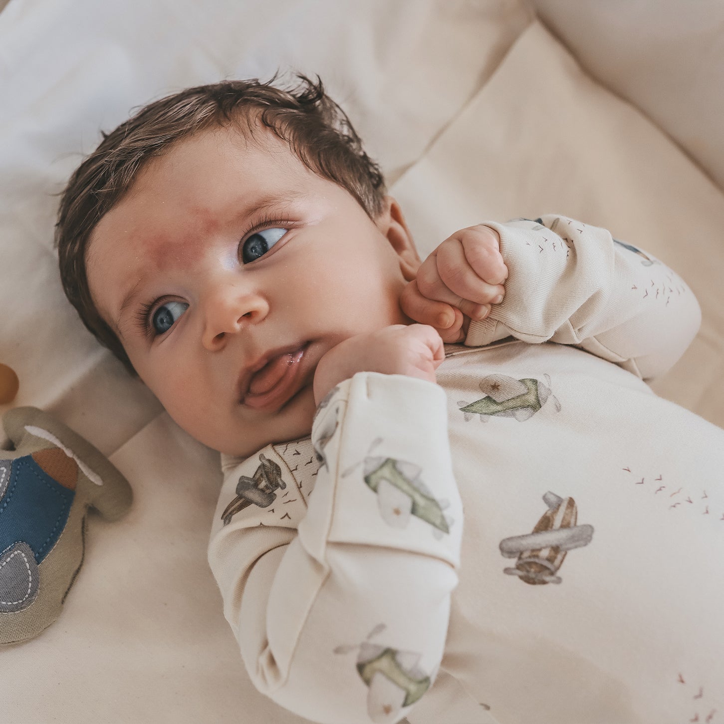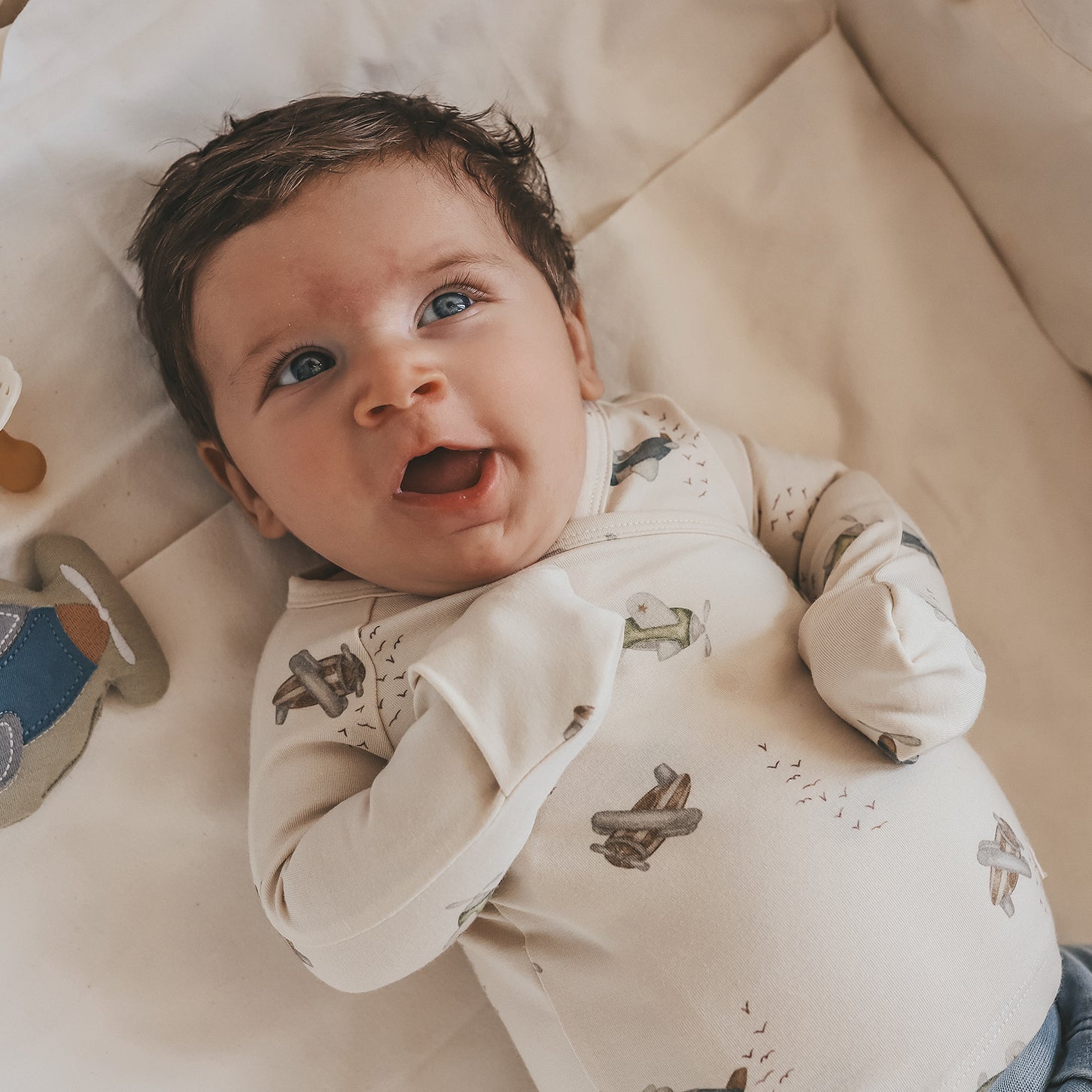 Het overslagshirtje heeft een mooie print, zacht stofje en ingebouwde handschoentjes die je makkelijk over de handjes heen kunt vouwen.