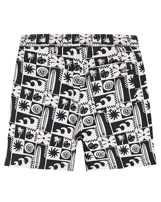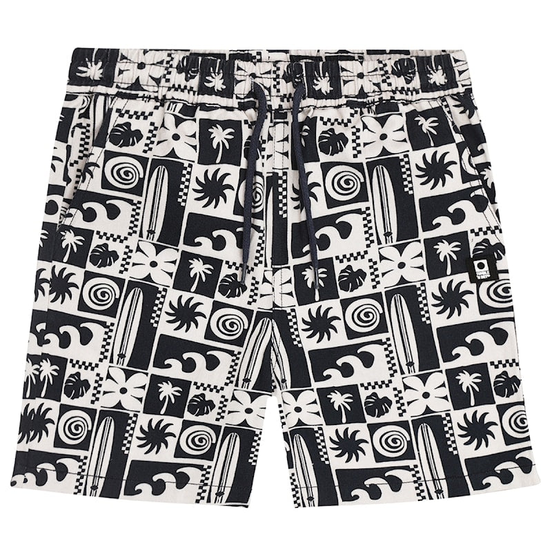 Deze vrolijke korte broek voor jongens is ideaal voor zomerse dagen. Gemaakt van 100% katoen biedt het een luchtige en comfortabele pasvorm. De zwart/wit print met tropische motieven, zoals golven, palmbomen en surfplanken, straalt een zomerse sfeer uit. De elastische tailleband met trekkoord zorgt voor extra draaggemak en een perfecte pasvorm. De duurzame katoenen stof en speelse print maken het een praktische en stijlvolle keuze voor elke zomerse outfit. Valt mooi op maat.