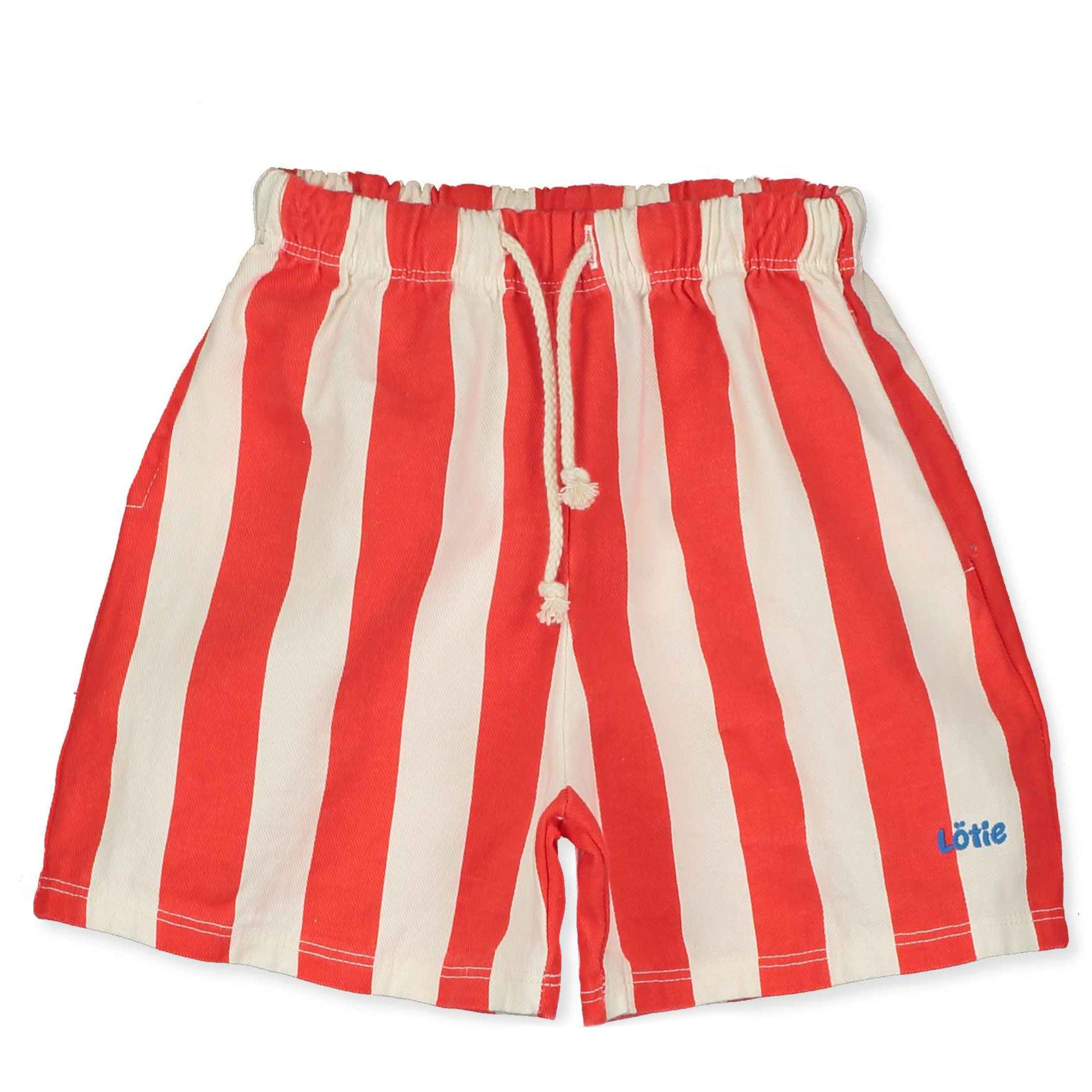 Leuke rood/wit gestreepte bermuda met elastische taille, koord om aan te spannen en zijzakken. Valt mooi op maat. Is een iets dikkere kwaliteit van katoen.